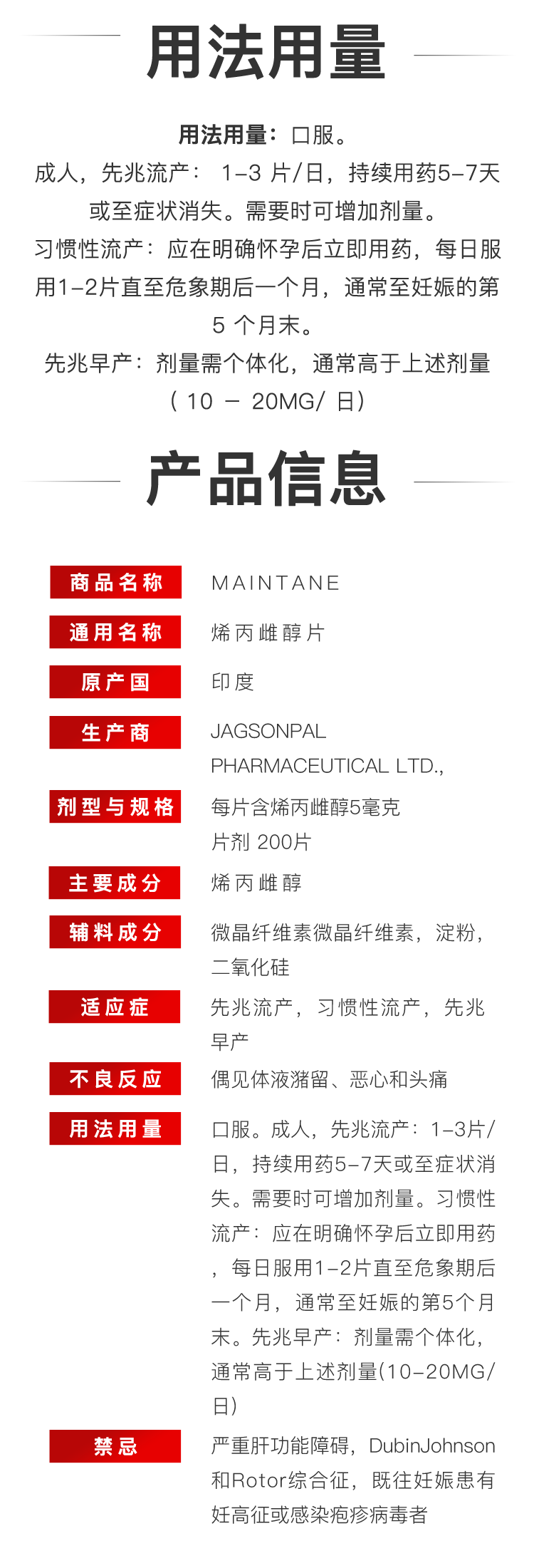 用法用量:口服。成人,先兆流产:1-3片/日,持续用药5-7天或至症状消失。需要时可增加剂量。习惯性流产:应在明确怀孕后立即用药,每次服用1-2片直至危象期后一个月,通常至妊娠的第5个月末。先兆早产:剂量需个体化,通常高于上述剂量(10-20mg/日)