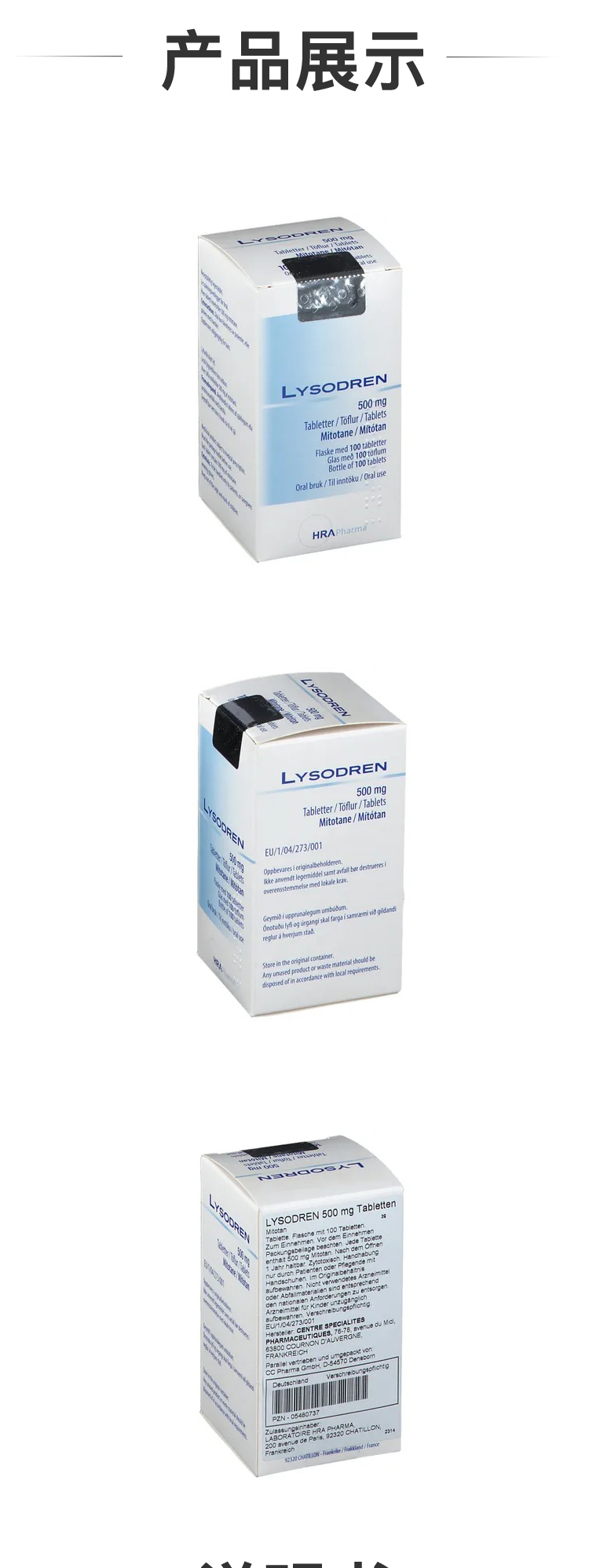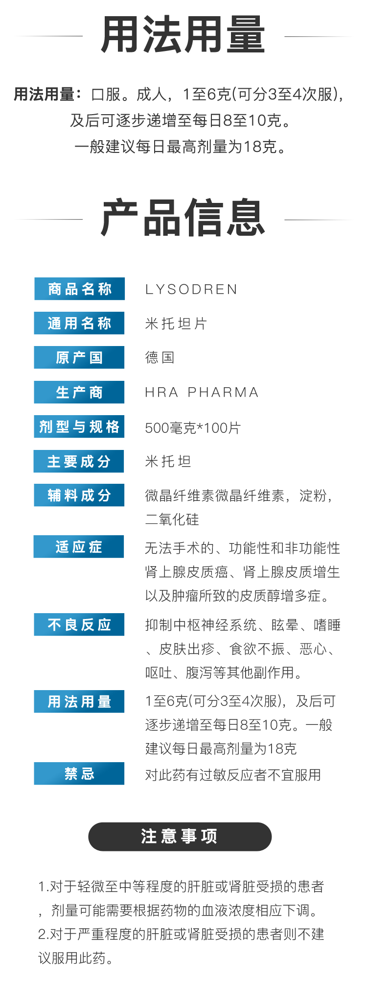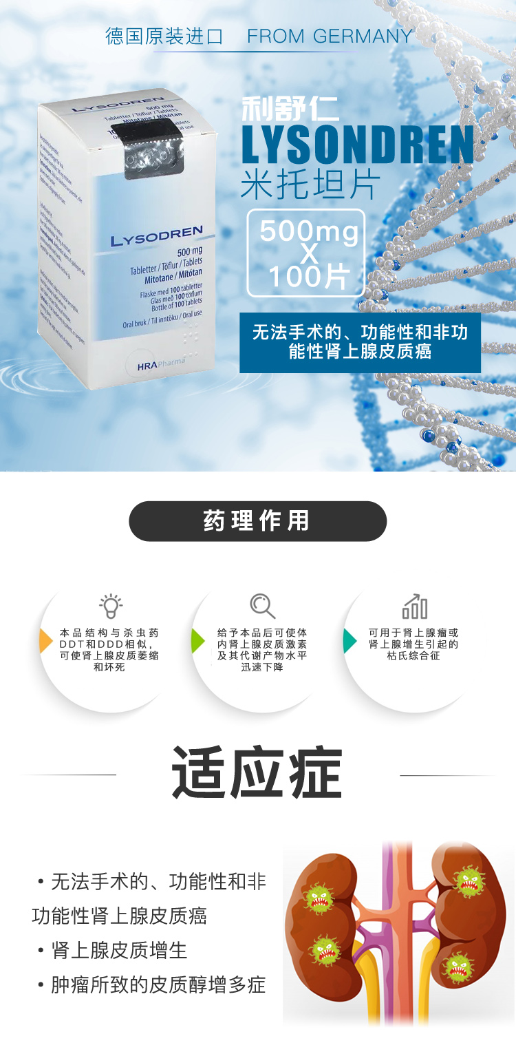 适应症/功能主治:无法手术的、功能性和非功能性肾上腺皮质癌、肾上腺皮质增生以及肿瘤所致的皮质醇增多症